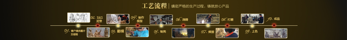 制作一件完美的鑄銅雕塑,最重要的步驟就是制作泥塑模型,然后再用工業硅膠拓印、翻模。所以泥塑的姿態、神情生動與否直接影響最終銅雕塑的品質。所以我廠一直對泥塑模型的制作格外重視。我廠以雕塑為本,以藝術為根,挾中華文化之傳統,偕歐陸藝術之風韻,風格獨特,盡顯淋漓盡致。我們本著大膽創新、勇于突破的精神,以追求卓越為導向,堅持寧缺勿濫為原則,并可依照您提供的要求,為您量身設計制作。我廠人才濟濟,有智慧嚴謹的管理班子,眾多年輕充滿激情、充滿創意的專業設計團隊、有專業技術精湛的雕塑制作人才和專業的施工隊伍。他們不僅具深厚的文化藝術底蘊,更汲取當代雕塑精華,博采眾家之長,作品既有嚴肅莊重寫實題材,也有輕松前衛的抽象題材,表現手法上浪漫主義中不乏樸實,現實主義中蘊涵著激情,設計理念貫穿古今、融匯中西,深刻詮釋著藝術的精髓,把古典主義和后現代主義完美的融合,將雕塑藝術演繹為力的凝聚、美的體現,讓人們感受到的不僅是一種藝術的浪漫與優雅、粗獷與悲壯、更是豐富的優秀藝術寶藏和文化傳統,讓您在藝術與文化中穿流,在時空中飄蕩,使靈魂在藝術的海洋洗禮。 MORE+